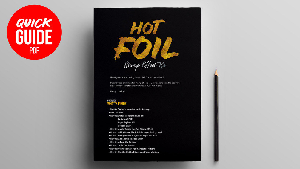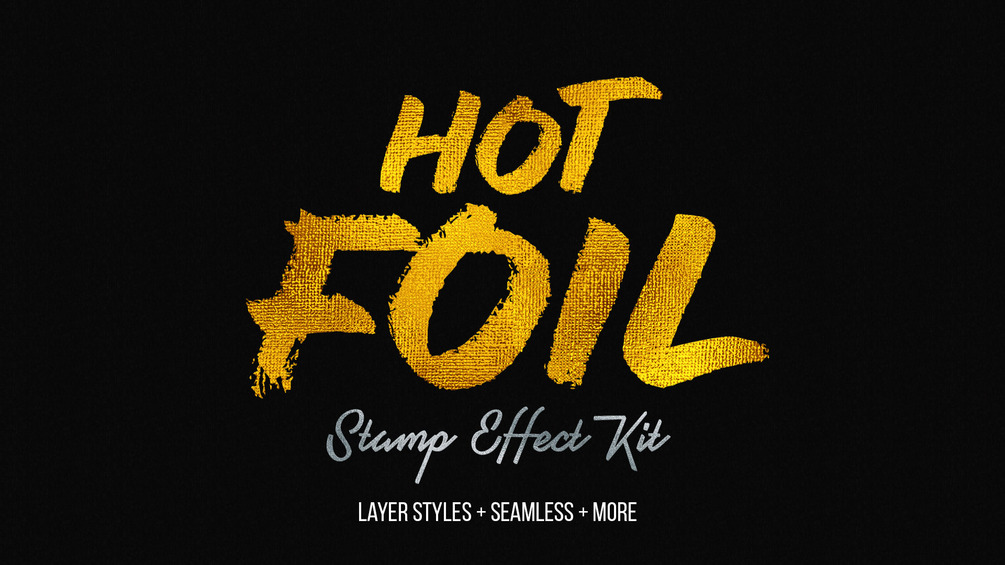 Get 5 unique hot foil stamp effect Photoshop layer styles and 5 seamless metallic foil textures in 3 colors—Gold, Rose Gold & Silver.
